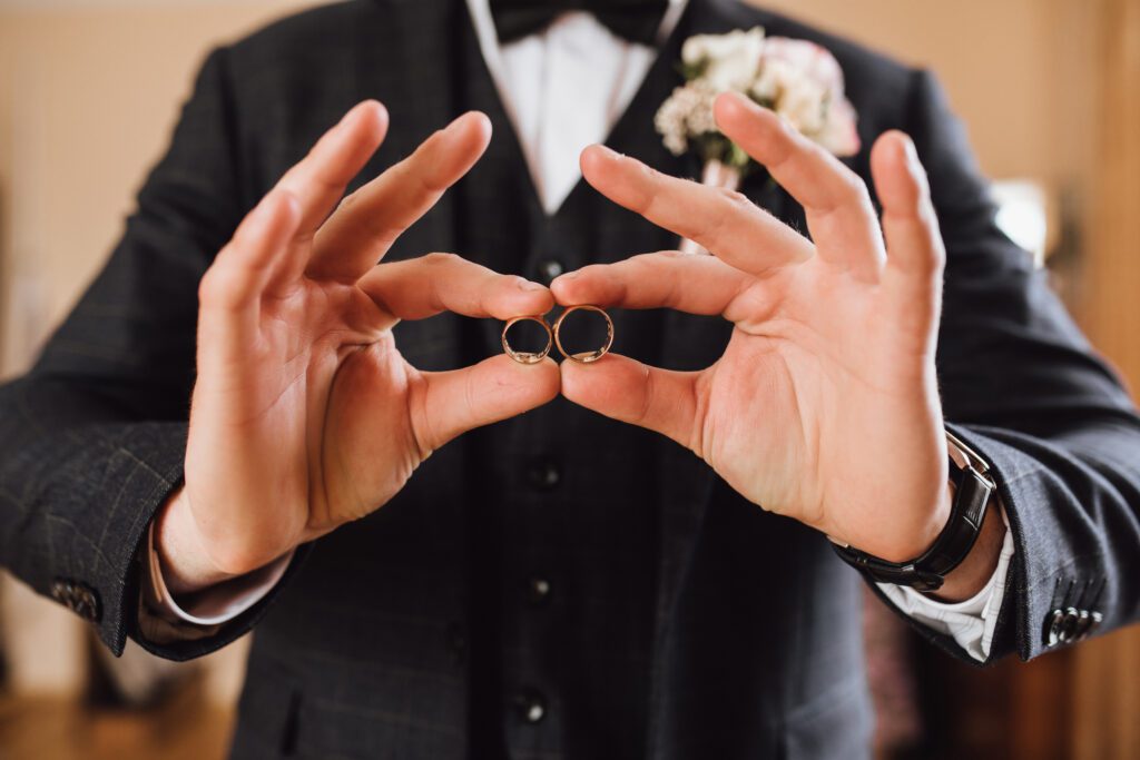 Groom demonstrates two wedding rings, without face