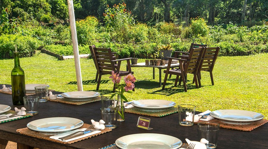 A estrutura do local inclui uma construção rústica e bem ambientada, que harmoniza perfeitamente com o entorno natural. O salão interno e as áreas cobertas oferecem conforto e praticidade, enquanto a horta de orgânicos do espaço adiciona um toque especial à experiência, permitindo que os convidados desfrutem de alimentos frescos e saudáveis.